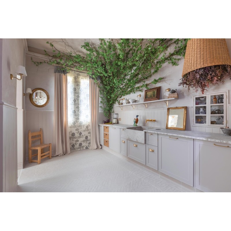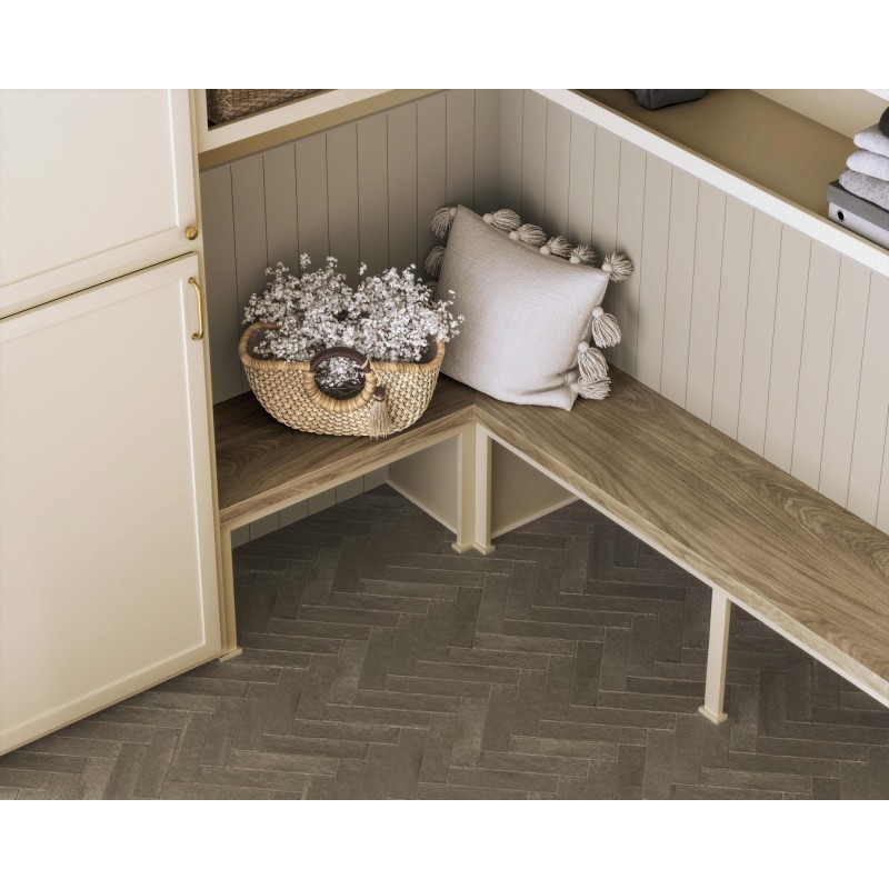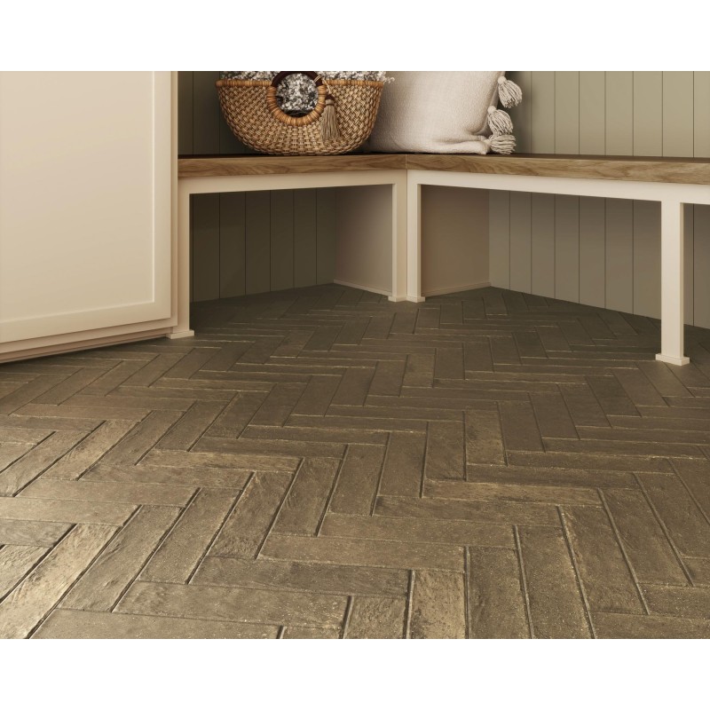The collection includes wood paneling effect tiles with skirting and bordering as well as a matching herringbone.